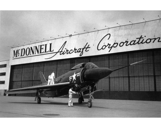 McDonnell Aircraft Corporation was awarded the contract to design and produce the Phantom, the Navy’s first jet fighter, which in 1946 became the first American jet to operate from an aircraft carrier. When Curtiss-Wright ended aircraft production after WWII, McDonnell Aircraft took over its former plant at Lambert.