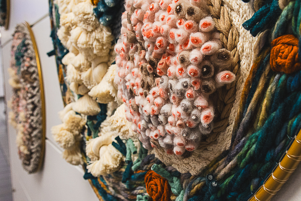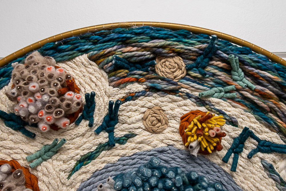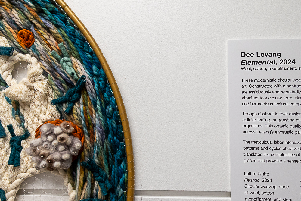 These modernistic circular weavings embody Levang’s innovative approach to fiber art. Constructed with a nontraditional warping technique she developed, the pieces are assiduously and repeatedly cut, knotted, and woven onto a monofilament matrix attached to a circular form. Hundreds of individually placed fibers create hypnotic and harmonious textural compositions.
