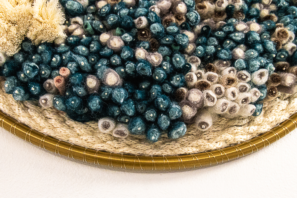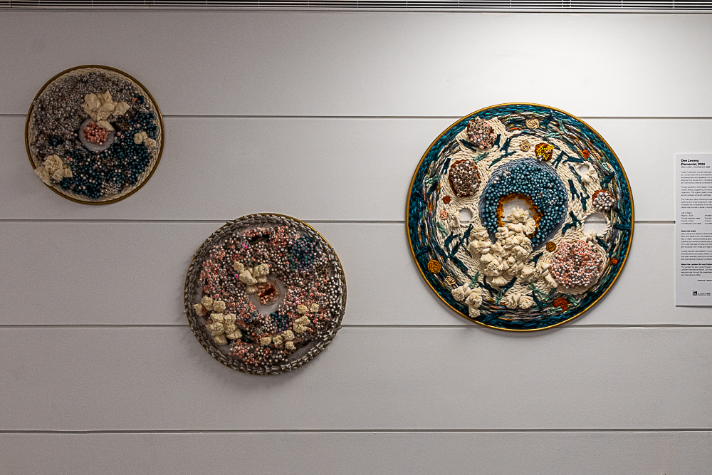 Though abstract in their design motifs, the pieces convey a vaguely biological and cellular feeling, suggesting microscopic landscapes or cross-sections of living organisms. This organic quality connects to the common embedded motifs found across Levang’s encaustic paintings, linking her multidisciplinary bodies of work.