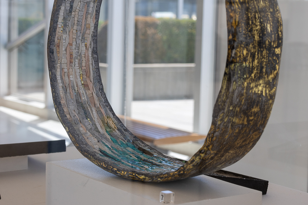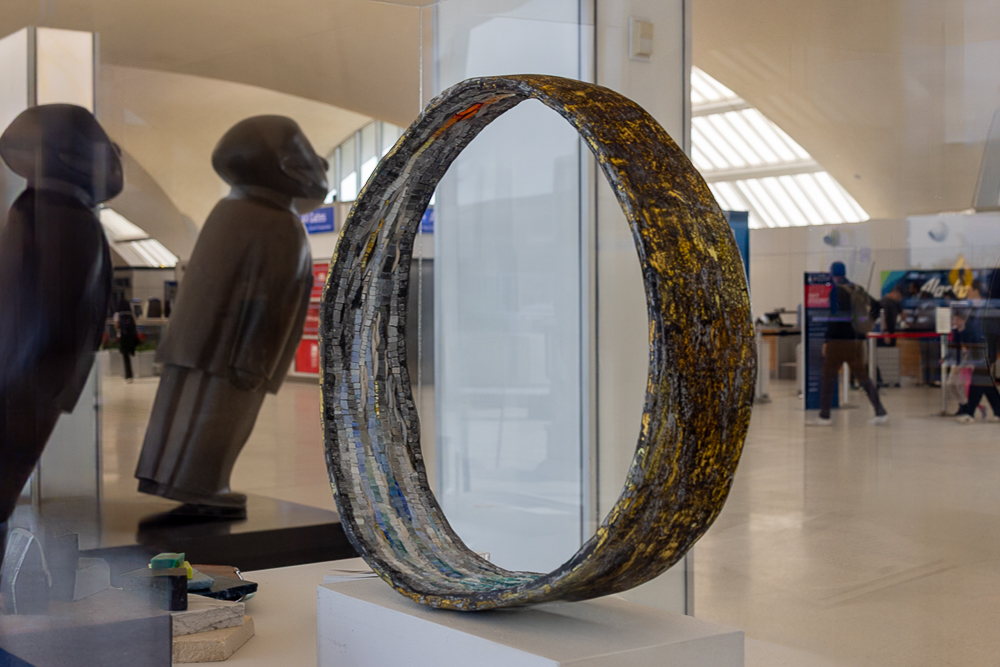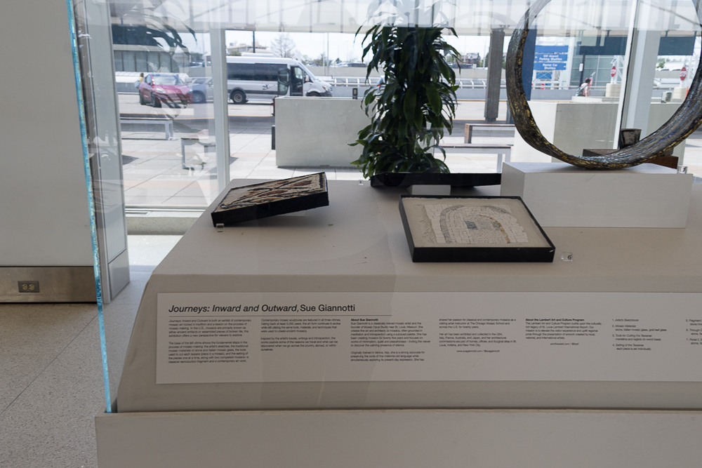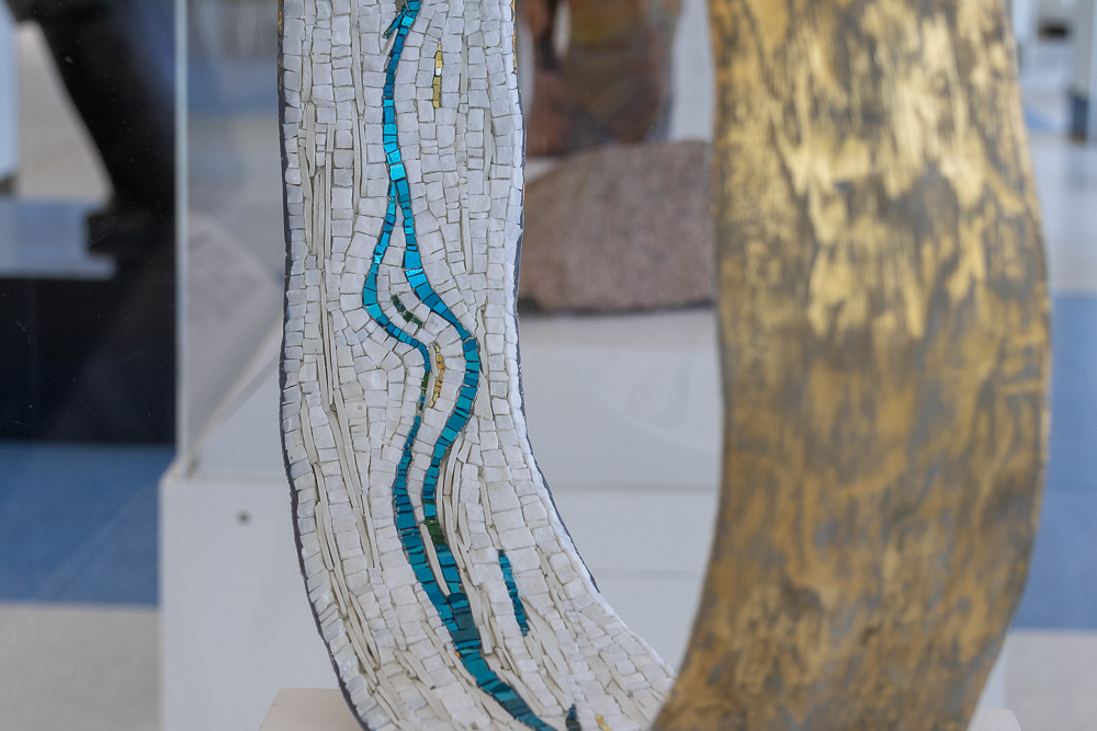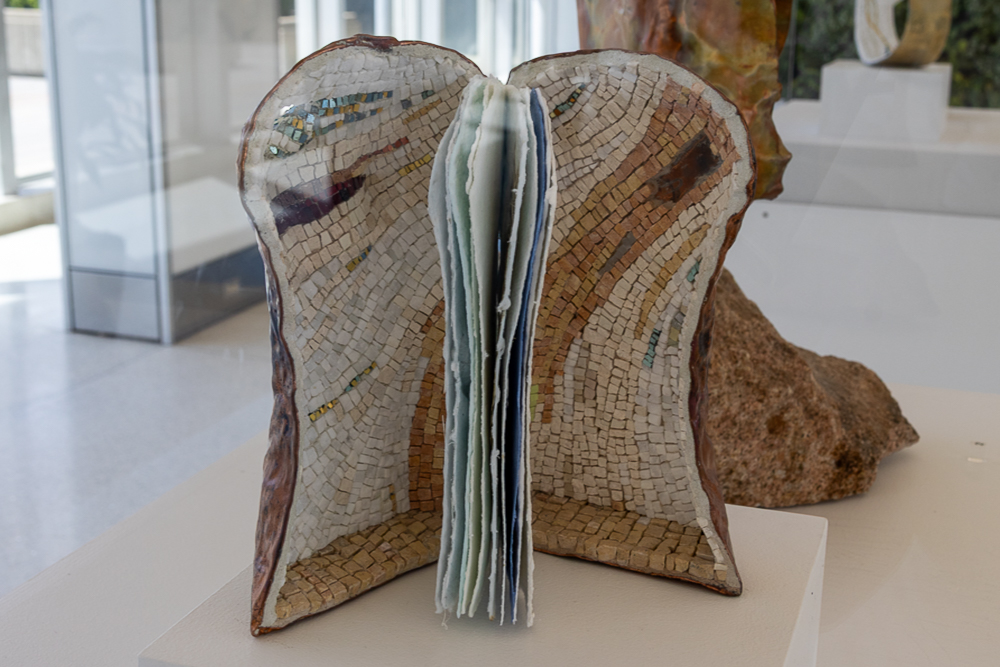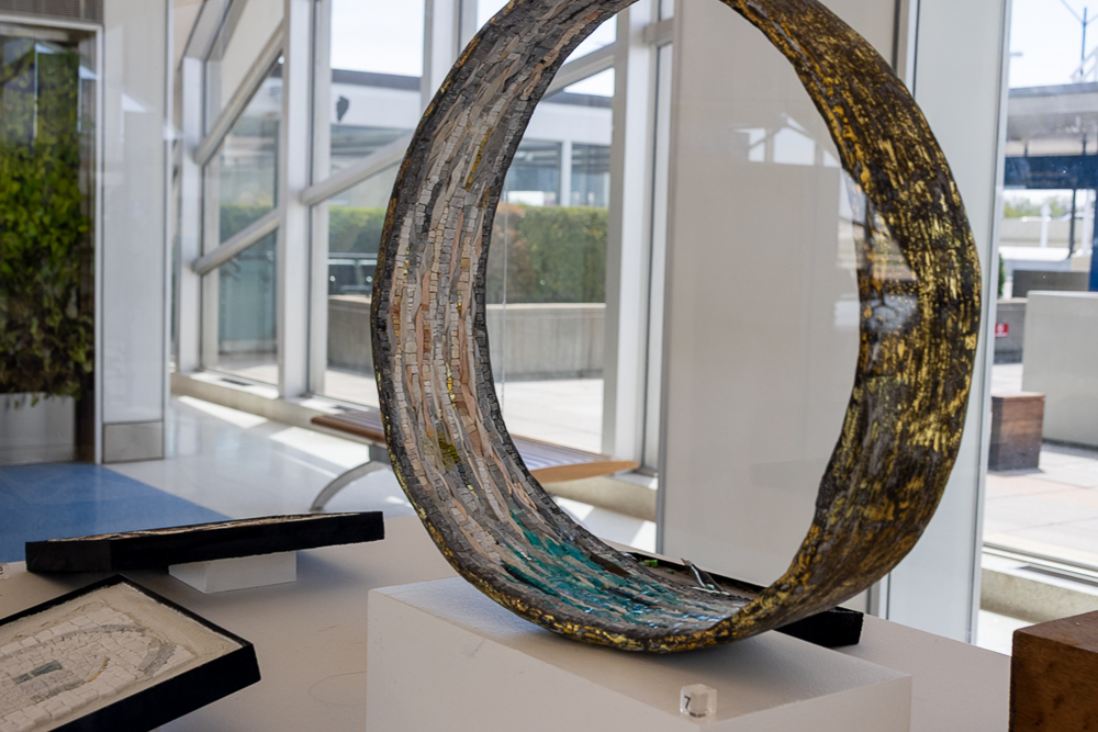 Contemporary mosaic sculptures are featured in all three vitrines. Dating back at least 5,000 years, the art form continues to evolve while still utilizing the same tools, materials, and techniques that were used to create ancient mosaics. Inspired by the artist’s travels, writings and introspection, the works explore some of the reasons we travel and what can be discovered when we go across the country, abroad, or within ourselves.