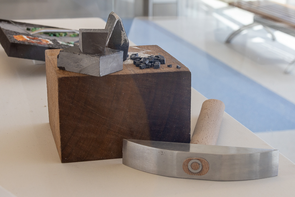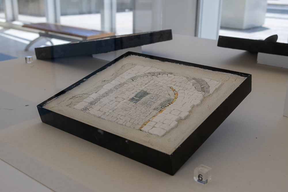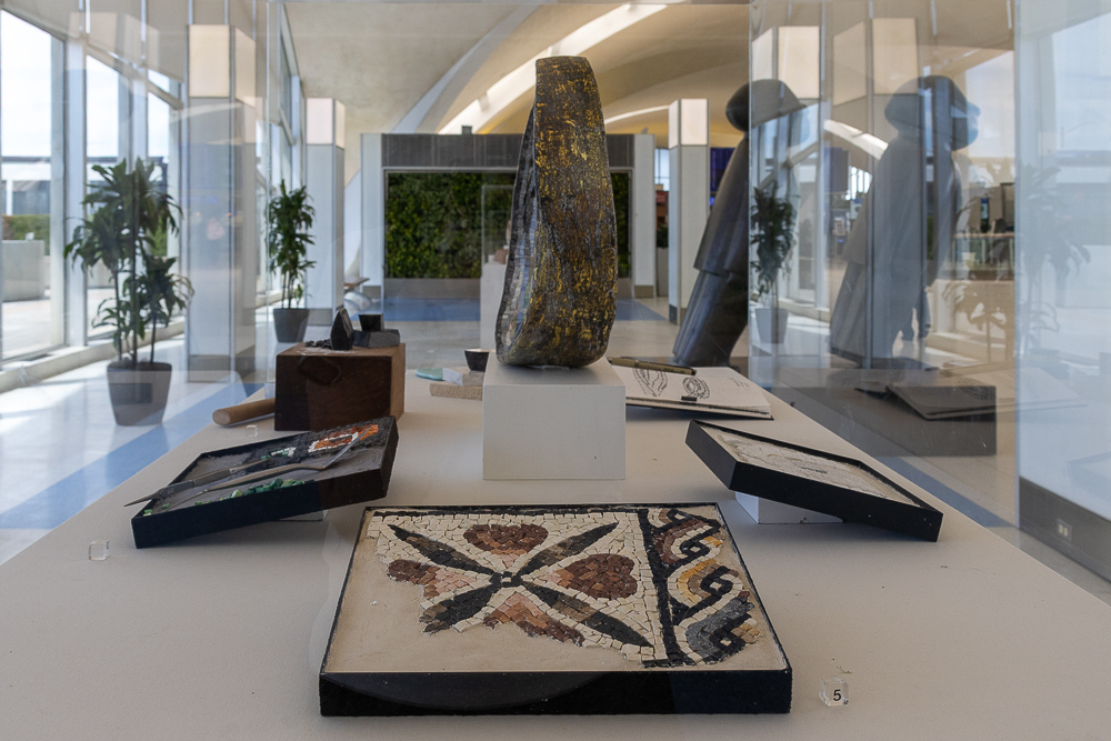 The base of the left vitrine shows the fundamental steps in the process of mosaic-making: the artist’s sketches, the traditional mosaic materials of stone and Italian mosaic glass, the tools used to cut each tessera (piece in a mosaic),and the setting of the pieces one at a time, along with two completed mosaics—a classical reproduction fragment and a contemporary art work.