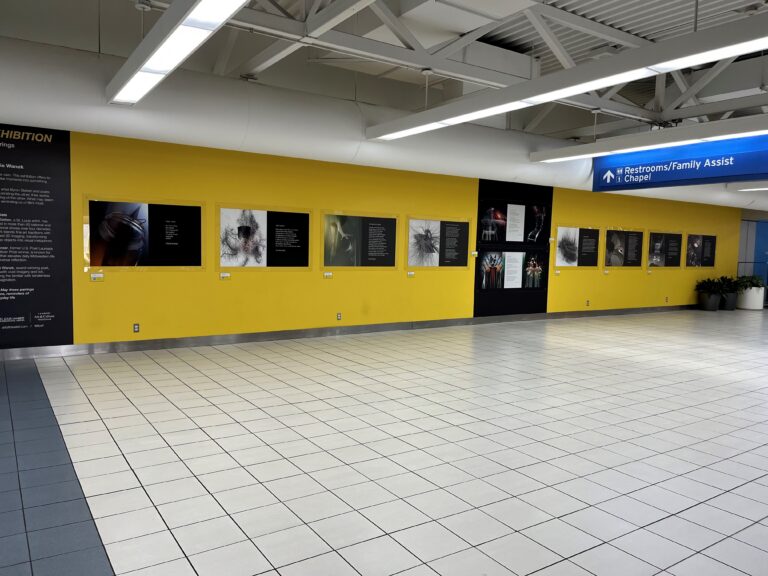 The exhibition Wayfinding was composed of seven pieces made from found signage: dash, channel II, lock, decibel, parlance, towers of babble VN and AG, and the freestanding Tower of Babble 24. The final piece of the exhibition, You Call It a Cloud: Ascent is a custom-made 22’ long collage of metallic words on wood, featuring a poem by St. Louis poet Stephanie Schlaifer.